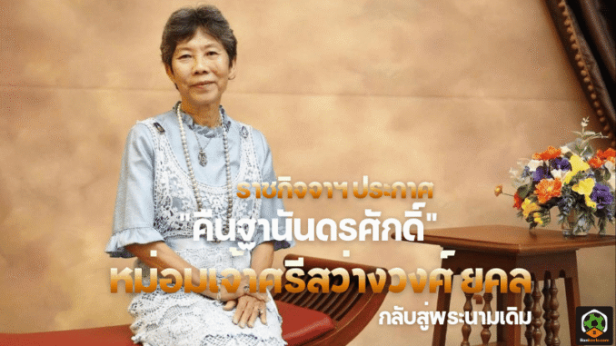A: ตามที่ข่าวสรุปจากประกาศ ระบุให้ “ท่านหญิงศรีสว่างวงศ์ บุญจิตราดุลย์” กลับเป็น “หม่อมเจ้าศรีสว่างวงศ์ ยุคล”