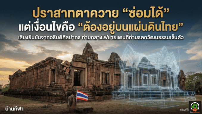 จุดที่ “บ้านกีฬา” อยากให้คนอ่านจับให้มั่นคือ ประโยคที่อธิบดีศิลปากรพูดตรงๆ ว่า กรมศิลปากรมีอำนาจบูรณะได้เฉพาะโบราณสถานที่อยู่ในอาณาเขตประเทศไทยเท่านั้น —นี่คือเหตุผลที่คำว่า “อยู่บนแผ่นดินไทย” ถูกยกมาเป็นเงื่อนไขสำคัญที่สุดของการซ่อมแซม