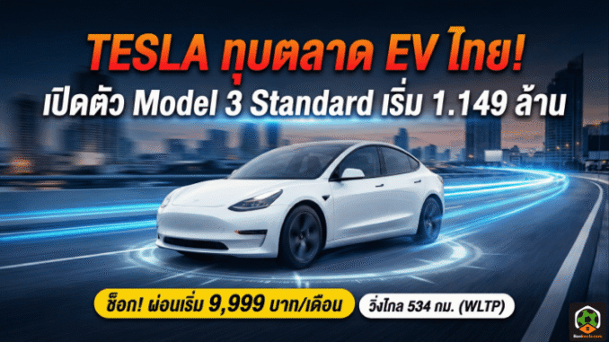 ตลาดรถไฟฟ้าไทยต้นปีนี้มีสะเทือนแบบได้ยินกันทั้งโชว์รูม เมื่อ Tesla ประเทศไทยเปิดตัวรุ่นเริ่มต้นใหม่ “Model 3 Standard” อย่างเป็นทางการ ด้วยราคาเริ่มจับต้องได้สุดในไลน์อัป พร้อมแคมเปญผ่อนรายเดือนที่ปักหมุดไว้เร้าใจพอ ๆ กับสเปกการวิ่งไกลและชาร์จเร็วที่เป็นลายเซ็นของแบรนด์