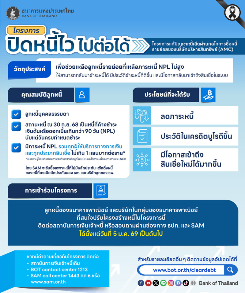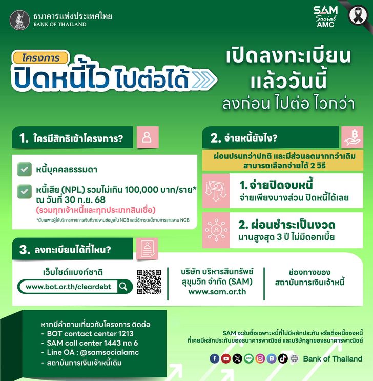 วันเริ่มลงทะเบียน: ตั้งแต่ 5 มกราคม 2569 เป็นต้นไป ผ่านเว็บไซต์ ธปท. / ช่องทาง SAM / หรือสถาบันการเงินที่เข้าร่วม (ระยะแรกเน้นลูกหนี้ธนาคารพาณิชย์และบริษัทในกลุ่มฯ ก่อน)