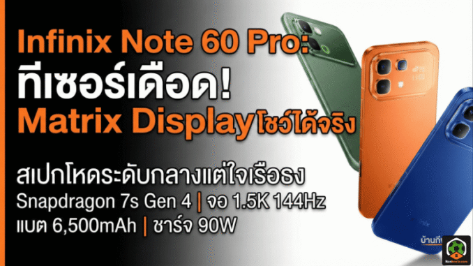 บ้านกีฬา ขอสรุปให้แบบตรงประเด็นว่า Infinix Note 60 Pro กำลังเดินเกม “มือถือคุ้มค่าที่มีลูกเล่นแบบรุ่นแพง” ด้วยไฮไลต์สำคัญคือ Matrix Display หรือจอ Dot Matrix ที่ฝังอยู่บนโมดูลกล้องหลัง ใช้แสดงข้อมูลเรียลไทม์ได้จริง ไม่ได้เป็นแค่ไฟสวย ๆ ถ่ายรูปลงโซเชียลแล้วจบ โดยหลายสื่ออธิบายตรงกันว่าแนวคิดนี้ให้อารมณ์คล้าย Nothing Phone แต่ Infinix เอามาปรับให้เป็นจอแสดงผลแนว Dot-matrix ในโมดูลกล้องของตัวเอง