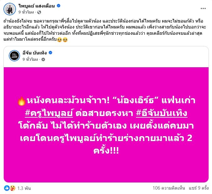 อีกช่วงหนึ่งของข่าว ครูไพบูลย์ยังโพสต์ทำนองว่า หากอีกฝ่ายยังไม่จบ ขอให้สื่อไปดู “ตัวจริงและประวัติ” ของฝ่ายหญิงก่อน และบอกว่าจะไม่ขอแก้ตัวหรืออธิบายเพิ่ม.