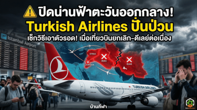 เหตุปิดน่านฟ้าและความผันผวนของเส้นทางบินในตะวันออกกลางรอบนี้สะเทือนทั้งระบบ ตั้งแต่เที่ยวบินยกเลิก ดีเลย์ ไปจนถึงการอ้อมเส้นทางที่ทำให้การต่อเครื่องซับซ้อนขึ้น Turkish Airlines ในฐานะสายการบินเครือข่ายใหญ่ก็ได้รับผลกระทบตามธรรมชาติ โดยเฉพาะเส้นทางไปยังหลายประเทศในภูมิภาคและเที่ยวบินเชื่อมต่อที่อาจรวนเป็นลูกโซ่