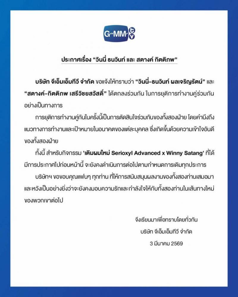 - ที่สำคัญ งานกิจกรรมที่ถูกประกาศไปก่อนหน้านี้อย่างกิจกรรม “เติมผมใหม่ Serioxyl Advanced x Winny Satang” ยังเดินหน้าตามกำหนดเดิมทุกประการ