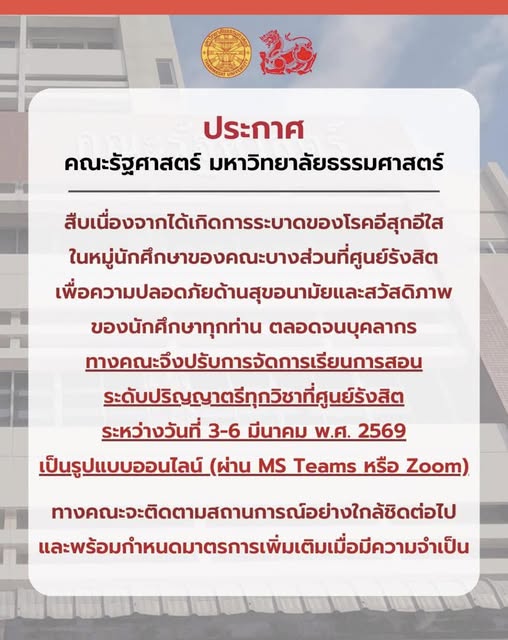 อีกภาพที่ชัดมากคือเหตุการณ์ในมหาวิทยาลัยแห่งหนึ่งที่พบการติดเชื้อจากกิจกรรมค่าย และมีการดำเนินมาตรการเข้มเพื่อหยุดการแพร่กระจาย รายงานระบุว่าตรวจพบผู้ติดเชื้อจากค่ายรวม 26 ราย และมีการปรับการเรียนการสอนเป็นออนไลน์ต่อเนื่องถึงวันที่ 23 มีนาคม 2569 พร้อมเร่งทำความสะอาดอาคารเรียน จุดสัมผัสร่วม เพิ่มความถี่การฆ่าเชื้อ และเน้นการระบายอากาศให้มากขึ้น เพราะในพื้นที่จริง “มือจับประตู” กับ “ราวบันได” บางทีอันตรายไม่แพ้การยืนไหล่ชนกัน