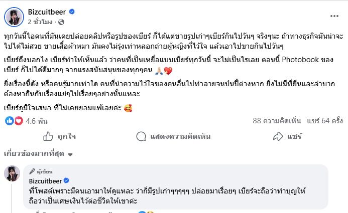 เบียร์ยังคอมเมนต์ชัดว่า ที่ออกมาโพสต์เพราะมีคนส่งหลักฐานให้ดูว่ายังมีการปล่อยของเก่าออกมาเรื่อยๆ และเธอจะ “ถือว่าทำบุญ” เหมือนให้เศษเงินต่อชีวิตอีกฝ่าย