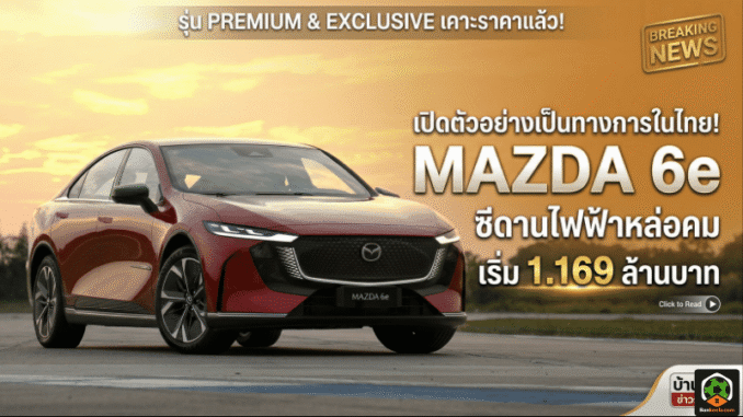 ใครที่รอวันเปิดราคา Mazda 6e ในไทยแบบใจจดใจจ่อ วันนี้ถือว่าได้คำตอบกันแบบชัดๆ เสียที เพราะมาสด้าเปิดราคาจำหน่ายอย่างเป็นทางการแล้วที่ 1,169,000 บาท สำหรับรุ่น Premium และ 1,199,000 บาท สำหรับรุ่น Exclusive นำเข้าแบบ CBU จากจีน พร้อมวางตัวเป็นรถไฟฟ้า D-Segment ที่จะเข้ามาเขย่าตลาดด้วยจุดขายสำคัญคือดีไซน์ที่ยังคงกลิ่นอายความเป็นมาสด้าเต็มคัน และฟีลการขับที่แบรนด์พยายามย้ำว่าไม่ได้เป็นแค่ EV ทั่วไป แต่เป็น EV ที่ยังต้อง “ขับสนุกแบบมาสด้า” ให้ได้จริง