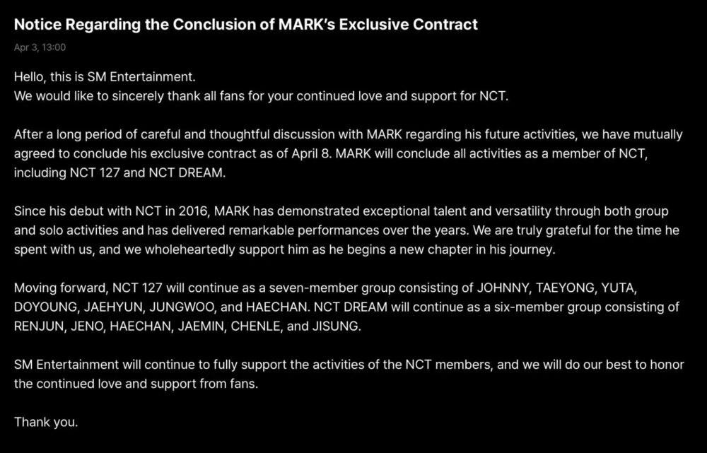 SM Entertainment ระบุชัดว่า หลังจากการพูดคุยกันอย่างยาวนานและรอบคอบ ทั้งสองฝ่ายได้ตกลงร่วมกันที่จะยุติสัญญา โดยมาร์คจะสิ้นสุดกิจกรรมทั้งหมดในฐานะสมาชิก NCT รวมถึง NCT 127 และ NCT DREAM นั่นหมายความว่าแฟน ๆ กำลังเห็นจุดจบของยุคสำคัญอีกยุคหนึ่งของวงที่มีโครงสร้างซับซ้อนและมีการขับเคลื่อนหลายยูนิตพร้อมกัน