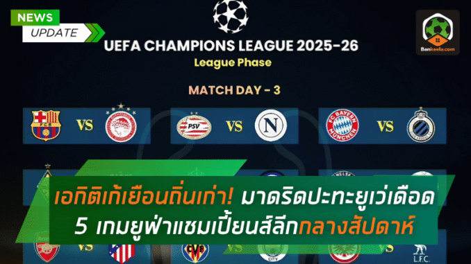 ศึก ยูฟ่า แชมเปี้ยนส์ ลีก กลับมาระอุอีกครั้งในสัปดาห์นี้ และต้องบอกว่าโปรแกรมสุดเดือดร้อนแรงแบบไม่มียั้ง เพราะหลายทีมยักษ์ใหญ่พร้อมลงสนามในนัดที่ 3 ของรอบ ลีกเฟส ความเข้มข้นพุ่งทะยานเต็มพิกัด ทั้งสถิติ ความฟิต ความคาดหวัง และแรงกดดันที่ไม่อาจมองข้าม นี่คือ 5 เกมสุดมันที่สายลูกหนังไม่ควรพลาดตลอดคืนวันอังคารและพุธนี้