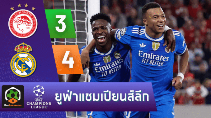 เรอัล มาดริด ยิงนำขาดถึง 3-1 ตั้งแต่ครึ่งแรก จากแฮตทริกฉับไวของ คีเลียน เอ็มบัปเป้ ก่อนที่ครึ่งหลัง โอลิมเปียกอส จะฮึดคืนสองลูกจาก เมห์ดี้ ทาเรมี และ อายูบ เอล คาบี ไล่กดดันจน “ราชันชุดขาว” ต้องเอาตัวรอดแบบหืดจับ แต่สุดท้ายยังรักษาสกอร์ 4-3 เก็บสามแต้มสำคัญกลับมาดริดได้สำเร็จ