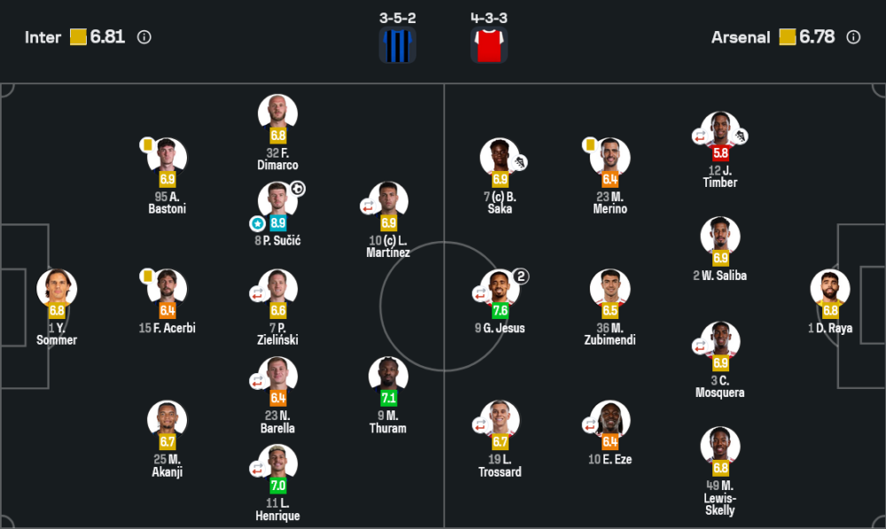 ฝั่งอาร์เซนอลยืน 4-3-3 ที่ชัดเจน ซูบิเมนดี้ยืนต่ำหน้าเซ็นเตอร์เป็นตัวคุมจังหวะ เมริโน่กับเอเซ่ดันขึ้นไปบีบคู่กลางอินเตอร์ ทำให้ปืนใหญ่สามารถเพรสสูงตั้งแต่แดนหน้า เชซุสไม่ใช่แค่คนจบสกอร์ แต่ขยันวิ่งไล่บี้จนอินเตอร์ต่อบอลจากหลังขึ้นหน้าลำบาก เมื่อแย่งบอลได้แล้วใช้สปีดของซาก้าและการหาพื้นที่ของทรอสซาร์เล่นงานแนวรับสามคนของเจ้าถิ่นแบบต่อเนื่อง