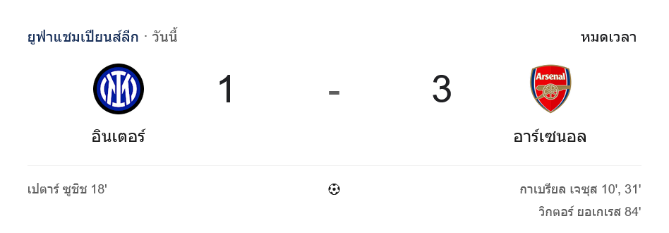 เกมนี้คืออีกหนึ่งค่ำคืนที่สาวกปืนใหญ่ยิ้มกว้าง ส่วนแฟนอินเตอร์ต้องเก็บความผิดหวังไว้เป็นบทเรียน บ้านกีฬาเชื่อว่าจากนี้ทุกนัดของทั้งสองทีมจะยิ่งเดือดขึ้นเรื่อยๆ แฟนบอลที่อยากเกาะติดทุกสกอร์แบบสายฮาร์ดคอร์ อย่าพลาดตามเช็กผลและข่าวเด็ดสไตล์ไทยๆ ได้ที่ บ้านผลบอล และบทวิเคราะห์มันส์ๆ จากบ้านกีฬา เราจะเกาะทุกจังหวะของโลกฟุตบอลมาเล่าให้ฟังแบบถึงลูกถึงคนเหมือนเดิม