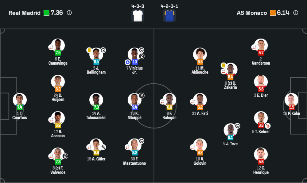 แม้เอ็มบัปเป้จะซัดเบิ้ล แต่คนที่เปลี่ยนเกมให้เรอัล มาดริดแบบชัดที่สุดคือ วินิซิอุส จูเนียร์ ปีกแซมบ้าทำคะแนนเฉลี่ยถึง 10 เต็ม เขาเล่นงานแบ็กขวาโมนาโกแทบทั้งเกม ทั้งสปีดต้น การเลี้ยงจี้ และความเกรี้ยวกราดในการดวลหนึ่งต่อหนึ่ง สถิติเด่นคือยิง 1 ประตู จ่าย 2 แอสซิสต์ ให้เอ็มบัปเป้และมาสตันตูโอโน่ แถมมีส่วนร่วมในประตูอื่น ๆ ด้วยการดึงตัวประกบออกจากพื้นที่ ทำให้เพื่อนสอดขึ้นมาจบสกอร์ได้ง่ายขึ้น ถือเป็นเกมที่ย้ำชัดว่าแผงหน้ามาดริดยุคใหม่อันตรายทุกคน ไม่ใช่แค่ซูเปอร์สตาร์รายเดียว
