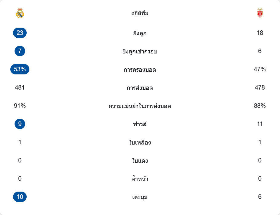 ตัวเลขสถิติบอกภาพรวมได้ชัดเจน เรอัล มาดริดครองบอล 53% ต่อ 47% แต่ที่ต่างกันคือคุณภาพของโอกาส เจ้าถิ่นยิงทั้งหมด 23 ครั้ง เข้ากรอบ 7 ครั้ง ซึ่งเปลี่ยนเป็น 6 ประตู ส่วนโมนาโกยิง 18 ครั้งแต่เข้ากรอบเพียง 6 ลูก กูร์กตัวส์จัดการเซฟได้แทบหมด