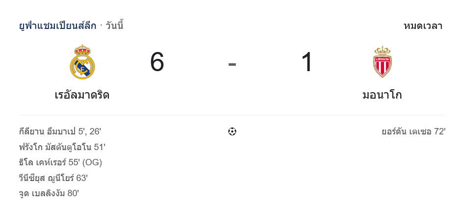 - ⚽ 5′ เรอัล มาดริดขึ้นนำ 1-0 คีลิยัน เอ็มบัปเป้ รับบอลจากเฟเดริโก้ วัลเวร์เด้ ยิงด้วยขวาเสียบมุม