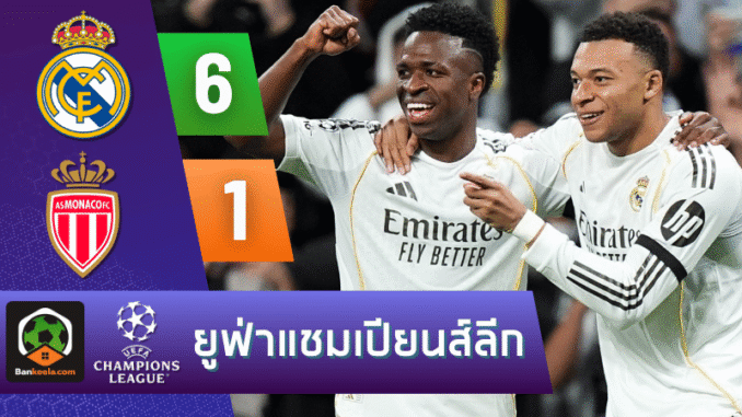 ค่ำคืนที่ซานติอาโก้ เบร์นาเบว แฟนบอลที่กดเช็ก ผลบอลสด กันแบบตาไม่กะพริบได้เห็นความโหดของแนวรุกเรอัล มาดริด ชัดเจนเต็มตา เมื่อ “ราชันชุดขาว” ระเบิดฟอร์มจัดหนักถล่ม โมนาโก 6-1 ในศึกยูฟ่า แชมเปี้ยนส์ ลีก รอบลีก 36 ทีม เกมนี้สามประสาน วินิซิอุส จูเนียร์ – คีลิยัน เอ็มบัปเป้ – ฟรังโก มาสตันตูโอโน่ เล่นกันอย่างกับโกงเกม ส่วนทีมเยือนแนวรับพังเป็นโดมิโน รับไม่อยู่ทั้งเกม