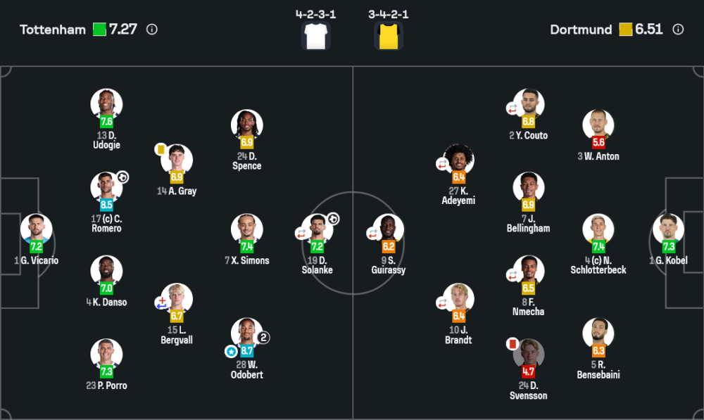 - จูนได ไบฟิลด์ – 6.7 (น.62 แทน แบร์กวัลล์) ลงมาช่วยแพ็คแดนกลาง ปิดพื้นที่ไม่ให้ดอร์ทมุนด์เล่นง่าย