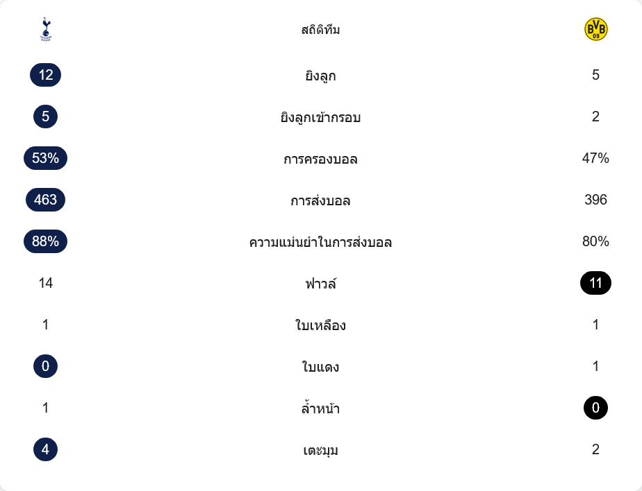 ตัวเลขหลังเกมสะท้อนรูปเกมได้ตรงไปตรงมา สเปอร์สยิงรวม 12 ครั้ง เข้ากรอบ 5 ครั้ง แปลงเป็น 2 ประตู ส่วนดอร์ทมุนด์ยิงเพียง 5 ครั้ง เข้ากรอบแค่ 2 ครั้ง ทั้ง ๆ ที่ต้องไล่ตามสกอร์ตลอด 70 นาทีหลัง การครองบอลใกล้เคียงกัน 53% ต่อ 47% แสดงให้เห็นว่าทีมเยือนไม่ได้ถอยมาอุดอย่างเดียว แต่ปัญหาคือเมื่อต้องเล่น 10 คน การต่อบอลขึ้นหน้าไม่ต่อเนื่อง
