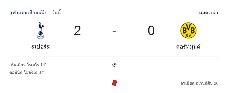 บ้านกีฬา พาเกาะทุกจังหวะแบบอารมณ์ ผลบอลสด จากลอนดอน สเปอร์สเปิดรังรับโบรุสเซีย ดอร์ทมุนด์ ในศึกยูฟ่า แชมเปี้ยนส์ ลีก รอบลีก เกมนี้เจ้าถิ่นมาในระบบ 4-2-3-1 เน้นความดุดันริมเส้น ส่วนทีมเยือนยืน 3-4-2-1 หวังเก็บแต้มกลับบ้าน แต่จุดเปลี่ยนก็มาถึงตั้งแต่ครึ่งแรกเมื่อดอร์ทมุนด์เหลือผู้เล่น 10 คน ก่อนที่ไก่เดือยทองจะอาศัยความคมหน้าปากประตูเชือดไป 2-0 จากลูกยิงของคริสเตียน โรเมโร และโดมินิก โซลันเก