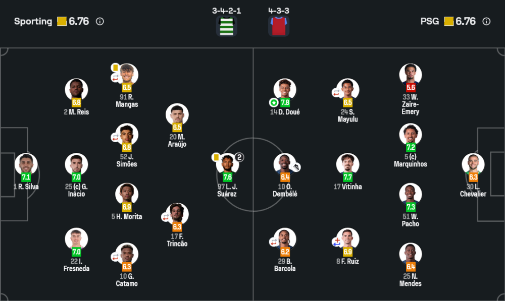 ดาวเด่นของเกมนี้ตกเป็นของ เดซีเร ดูเอ ปีกดาวรุ่งเปแอสเช ที่ได้คะแนนสูงถึง 7.8 แม้ทีมจะเป็นฝ่ายพ่ายแพ้ เด็กหนุ่มรายนี้สร้างปัญหาให้แนวรับสปอร์ติ้งตลอด 90 นาที ทั้งการลากเลื้อยกินตัว การดึงจังหวะให้เพื่อนเติมขึ้นมา รวมถึงการผ่านบอลทะลุช่องที่เปิดโอกาสให้เดมเบเลและบาร์กอล่ามีลุ้นยิงหลายครั้ง ความกล้าดวลหนึ่งต่อหนึ่งและความแข็งแกร่งทางร่างกายทำให้ดูเอโดดเด่นกว่าเพื่อนร่วมทีมในค่ำคืนนี้ และยืนยันว่าเขาคือหนึ่งในอาวุธใหม่ที่เปแอสเชต้องให้พื้นที่ในเกมใหญ่ต่อ ๆ ไป