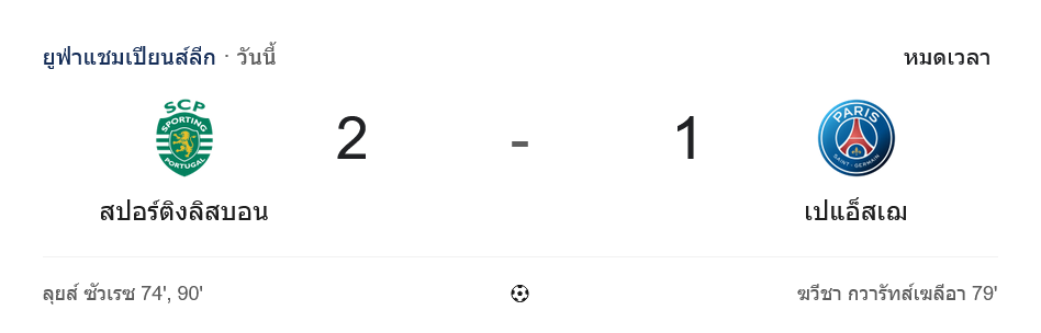 ศึกยูฟ่า แชมเปี้ยนส์ ลีกค่ำคืนสุดเดือดที่ลิสบอน สร้างดราม่าเต็มแมตช์ให้คอเช็กผลแบบสาย ผลบอลสด ต้องลุ้นจนวินาทีสุดท้าย เมื่อสปอร์ติ้ง ลิสบอน เปิดบ้านแซงชนะ ปารีส แซงต์ แชร์กแมง 2-1 จากการเหมาคนเดียวของ หลุยส์ ฆาเบียร์ ซัวเรซ นาที 74 และ 90 ส่วนเปแอสเชได้ประตูจาก ควิช่า ควารัตส์เคเลีย นาที 79
