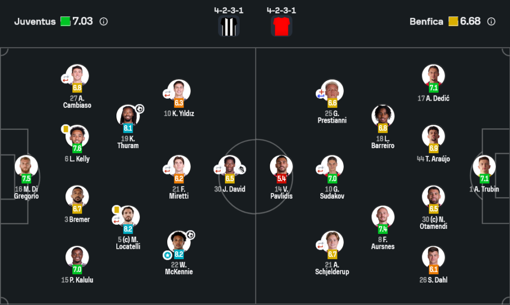คู่หูของเขาอย่าง Locatelli กับ Thuram ก็โดดเด่นไม่แพ้กัน โดยทั้งคู่มีเรตติ้งเกิน 8.0 เช่นกัน ขณะที่ฝั่งเบนฟิก้าคนที่เล่นได้มาตรฐานสูงสุดคือ Aursnes, Dedić และ Trubin แต่ก็ไม่เพียงพอจะฉุดผลการแข่งขันกลับมา