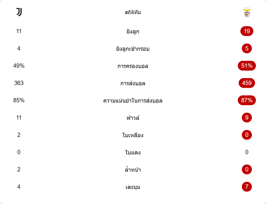 ตัวเลขหลังเกมสะท้อนภาพรวมได้ชัดเจน เบนฟิก้าเป็นฝ่ายยิงมากกว่าที่ 19 ครั้ง เข้ากรอบ 5 ครั้ง ขณะที่ยูเวนตุสยิง 11 ครั้ง เข้ากรอบเพียง 4 แต่ความคมต่างกันชัดเจนเมื่อเจ้าถิ่นเปลี่ยนสองโอกาสสำคัญเป็นสองประตูเต็ม ๆ การครองบอลก็ใกล้เคียงกัน 49% ต่อ 51% เบนฟิก้าเหนือกว่านิด ๆ ในเรื่องการต่อบอล 459 ต่อ 363 ครั้ง และมีความแม่นยำสูงถึง 87% ขณะที่ยูเวนตุสอยู่ที่ 85%