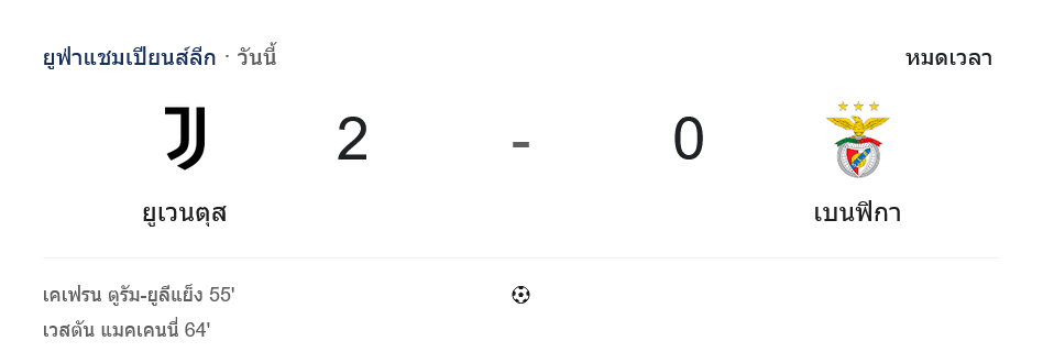 ดราม่ามาเข้มช่วงท้ายเมื่อเบนฟิก้าได้จุดโทษในนาที 80 จากจังหวะ VAR เช็กว่า Bremer ทำฟาวล์ในเขตโทษ แต่ Vangelis Pavlidis ซัดหลุดเสาไปแบบแฟนเหยียบหัวใจแตกกระจาย พลาดโอกาสตีไข่แตกอย่างไม่น่าเชื่อ ก่อนที่ยูเวนตุสจะปิดเกมอย่างนิ่ง ๆ แม้ช่วงท้าย Lloyd Kelly จะโดนใบเหลืองอีกใบ แต่สกอร์ไม่เปลี่ยน จบเกมยูเวนตุสอัดเบนฟิก้า 2-0 เก็บสามแต้มสำคัญในบ้านได้แบบมีแรงสั่นสะเทือนทั้ง บ้านผลบอล