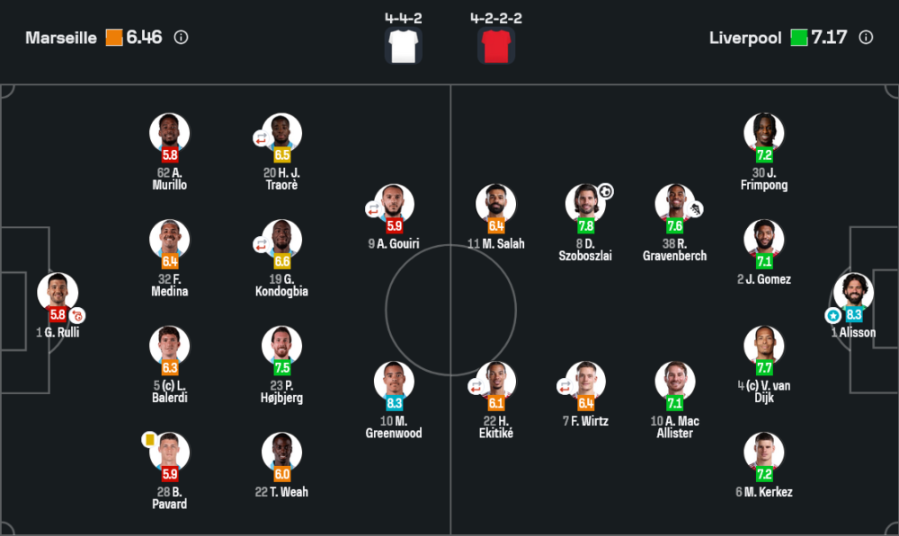 ฝั่งลิเวอร์พูลในระบบ 4-2-2-2 ใช้แม็ค อัลลิสเตอร์กับกราเฟนเบิร์ชคุมตรงกลาง แล้วปล่อยให้โซบอสซ์ไลและเวียร์ตซ์ลอยหาช่องระหว่างไลน์ รับส่งกันเร็วหนึ่ง–สองจังหวะ จากนั้นปล่อยให้ซาลาห์กับเอกิติเก้ฉีกตัววิ่งทำลายแนวรับเจ้าบ้าน จุดที่เห็นชัดคือทุกครั้งที่หงส์ได้สวน จะมีผู้เล่นเติมขึ้นมาพร้อมกันอย่างน้อย 3-4 คน ทำให้แนวรับมาร์กเซยถอยร่นไม่ทัน และสุดท้ายพลาดเสียทั้งฟรีคิกและจังหวะบอลแฉลบเข้าประตู