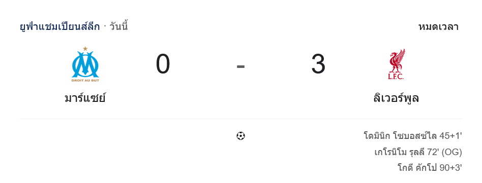 - 🔔 จบเกม มาร์กเซย 0-3 ลิเวอร์พูล เสียงนกหวีดสุดท้ายดังขึ้นพร้อมเสียงโห่จากเจ้าถิ่นและเสียงเฮของแฟนทีมเยือน