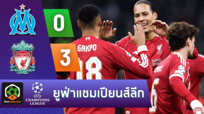 ศึก ยูฟ่า แชมเปี้ยนส์ลีก ลีกเฟสที่สต๊าด เวโลโดรม จบลงด้วยภาพที่แฟนเจ้าถิ่นไม่อยากเห็น เมื่อ โอลิมปิก มาร์กเซย โดน ลิเวอร์พูล บุกมาตบถึงถิ่น 0-3 จากประตูของโดมินิก โซบอสซ์ไล, ลูกทำเข้าประตูตัวเองของเกโรนิโม รูญี่ และการปิดบัญชีของโคดี กัคโป เกมนี้คนที่กดดู ผลบอลสด กันแบบเรียลไทม์คงสัมผัสได้ชัดว่า “หงส์แดง” เล่นกันนิ่งและคมกริบกว่า แม้รูปเกมโดยรวมจะไม่ได้ครองบอลเหนือกว่าเจ้าบ้านก็ตาม ขณะที่สกอร์สไตล์ บ้านผลบอล ขึ้นเต็มจอว่าคืนนี้คนเฮมีแต่ฝั่งทีมจากเมอร์ซีย์ไซด์