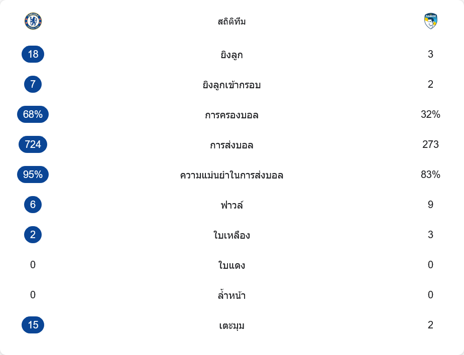 ตัวเลขหลังเกมสะท้อนรูปเกมแบบตรงไปตรงมา เชลซีครองบอลถึง 68% เทียบกับ 32% ของปาฟอส จ่ายบอลสำเร็จ 724 ครั้ง ด้วยความแม่นยำสูงถึง 95% ขณะที่ทีมเยือนจ่ายเพียง 273 ครั้ง แม่นยำ 83% เท่านั้น