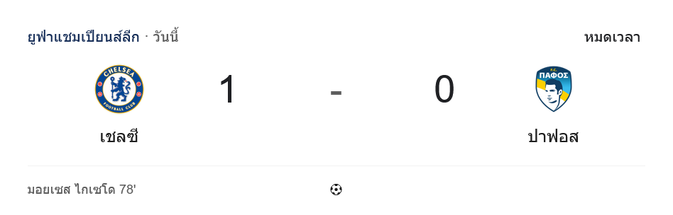 ท้ายเกมเชลซีเน้นคุมจังหวะ ใช้การครองบอลและเตะมุมถ่วงเวลา จนสิ้นเสียงนกหวีดสุดท้าย จบเกม เชลซีเฉือนปาฟอส 1-0 เก็บชัยสำคัญในบ้านต่อหน้าสาวกสิงห์บลูส์