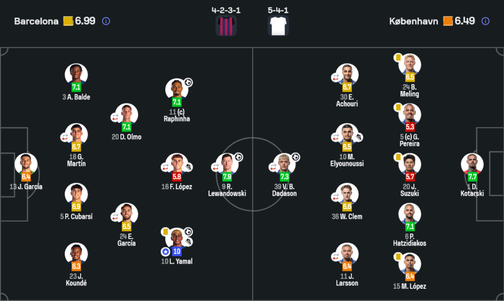 จุดเปลี่ยนสำคัญคือการปรับแดนกลางในครึ่งหลัง ใส่แบร์นาลลงมาช่วยคุมจังหวะ ทำให้บาร์ซ่าแก้เพรสแรกของโคเปนเฮเกนได้ง่ายขึ้น ลูกบุกริมเส้นฝั่งยามาลเล่นงานมาร์กอส โลเปซ กับเมลิงแทบตลอดเวลา เมื่อกองหลังทีมเยือนต้องถ่างตัวไปปิดด้านข้าง ช่องตรงกลางก็เปิดให้เลวานดอฟสกี้ใช้ความเก๋าหลอกดึงฟาวล์และหาเหลี่ยมจบ