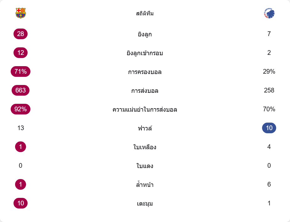 ถ้ามองแค่ตัวเลขก็รู้เลยว่าบาร์เซโลน่าคุมทุกอย่างอยู่หมัด เจ้าบ้านยิงรวมถึง 28 ครั้ง เข้ากรอบ 12 ครั้ง ขณะที่โคเปนเฮเกนได้ยิงเพียง 7 ครั้ง เข้ากรอบ 2 หนเท่านั้น การครองบอลบาร์ซ่ากวาดไป 71% ต่อ 29% ส่งบอลสำเร็จ 663 ต่อ 258 ครั้ง อัตราความแม่นยำในการจ่ายของเจ้าบ้านสูงถึง 92% ส่วนทีมเยือนอยู่ที่ 70%