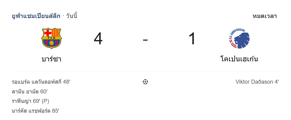 - ⏱️ นาที 90+7 – ผู้ตัดสินเป่านกหวีดจบเกม บาร์เซโลน่าถล่มโคเปนเฮเกน 4-1