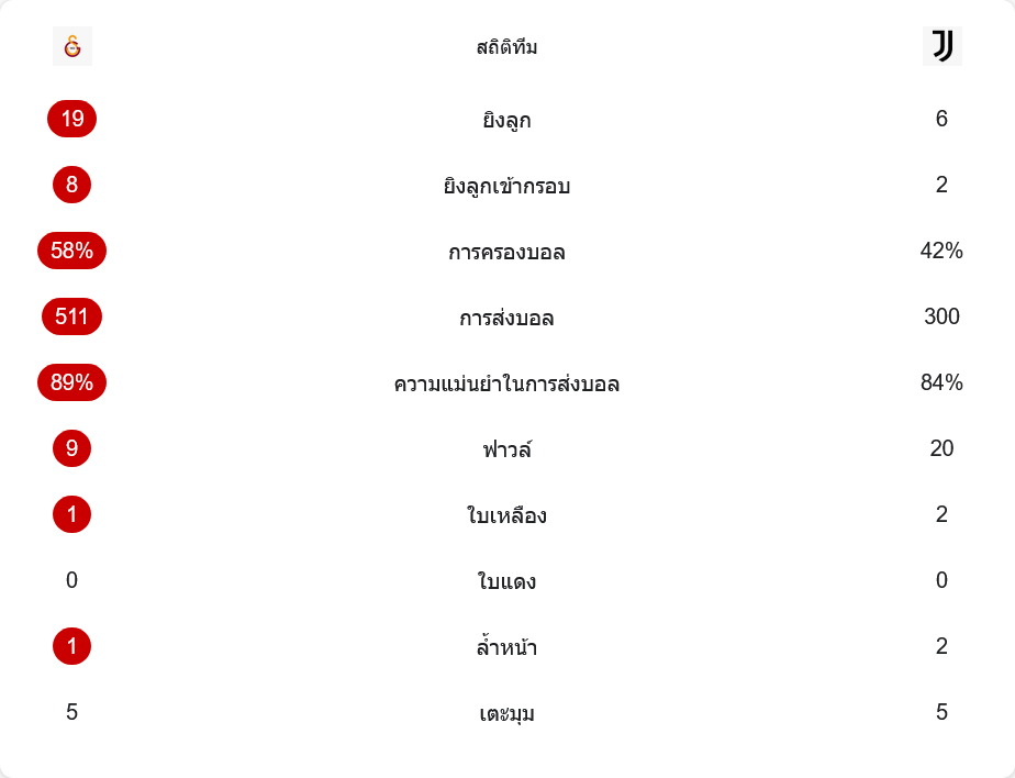 ภาพรวมเกมเป็นของกาลาตาซารายชัดเจน พวกเขายิงรวม 19 ครั้ง เข้ากรอบ 8 หน ขณะที่ยูเวนตุสมีโอกาสยิง 6 ครั้ง เข้ากรอบ 2 หน การครองบอลเจ้าบ้านเหนือกว่า 58% ต่อ 42% จ่ายบอลมากถึง 511 ครั้งด้วยความแม่นยำ 89% ส่วนยูเวนตุสจ่าย 300 ครั้ง ความแม่นยำ 84% อีกจุดที่สะท้อนความอึดอัดของทีมเยือนคือจำนวนฟาวล์ ยูเวนตุสฟาวล์ถึง 20 ครั้ง ในขณะที่กาลาตาซารายฟาวล์ 9 ครั้ง เกมมีใบเหลืองกาลาตาซาราย 1 ใบ ยูเวนตุส 2 ใบ และมีจังหวะใบแดงเปลี่ยนเกมในครึ่งหลัง นอกจากนี้ทั้งสองทีมได้เตะมุมเท่ากัน 5-5 และมีจังหวะล้ำหน้า กาลาตาซาราย 1 ครั้ง ยูเวนตุส 2 ครั้ง
