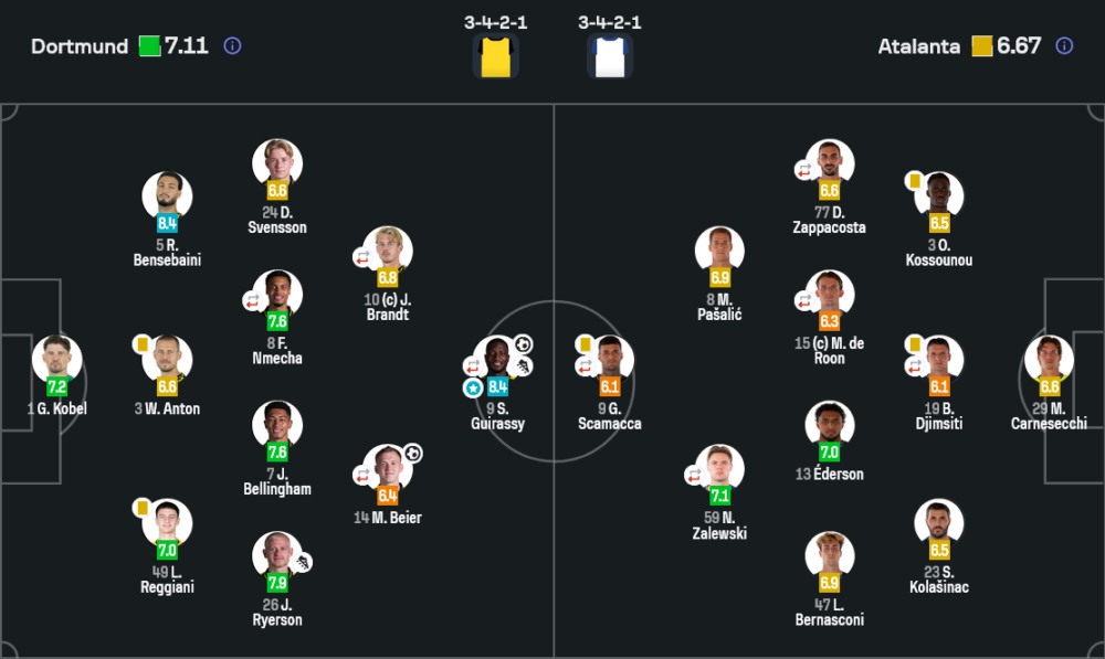 อตาลันต้าพยายามเร่งสปีด เติมคนขึ้นสูง ได้เตะมุม มีจังหวะยิงติดบล็อก และมีช่วงที่ดอร์ทมุนด์ต้องถอยมาตั้งโซน แต่เจ้าถิ่นเลือกเล่นแบบไม่ผลีผลาม เปลี่ยนตัวเติมความสดทั้ง อเดเยมี่, ชุควูเอเมก้า, ซาบิตเซอร์ และ ฟาบิโอ ซิลวา เพื่อคุมจังหวะสวนกลับและบี้แดนกลางให้เกมของอตาลันต้าไม่ไหลลื่น
