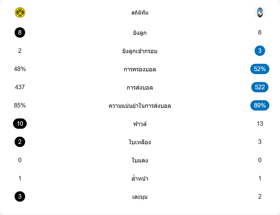 เรื่องการครองบอลอตาลันต้าถือบอลมากกว่า 52% ต่อ 48% และจ่ายบอลมากกว่าที่ 522 ครั้ง ขณะที่ดอร์ทมุนด์ 437 ครั้ง แถมความแม่นยำการจ่ายบอลก็สูงกว่า 89% ต่อ 85% อย่างไรก็ตาม ดอร์ทมุนด์ชนะเกมปะทะและคุมจังหวะฟาวล์ได้ดี มีฟาวล์ 10 ครั้ง ส่วนอตาลันต้า 13 ครั้ง เกมคุมอารมณ์มีใบเหลืองรวม 5 ใบ และจำนวนเตะมุมดอร์ทมุนด์ได้ 3 ครั้ง อตาลันต้า 2 ครั้ง สะท้อนว่าความอันตรายในกรอบของเจ้าถิ่น “ชัดและบ่อยกว่า” ในจังหวะที่จำเป็น