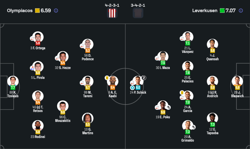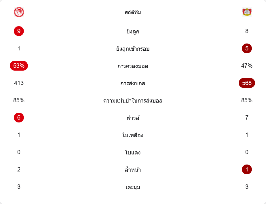 ภาพรวมเกมโอลิมเปียกอสยิงมากกว่าเล็กน้อย 9 ต่อ 8 แต่ความต่างอยู่ที่ “ความแม่น” เพราะเลเวอร์คูเซ่นยิงเข้ากรอบถึง 5 ครั้ง ขณะที่เจ้าบ้านเข้ากรอบแค่ 1 ครั้ง แม้การครองบอลเจ้าถิ่นจะเหนือกว่า 53% ต่อ 47% และจำนวนการจ่ายบอลก็มากพอตัว (413 ต่อ 568) โดยความแม่นยำเท่ากันที่ 85% ทั้งคู่ เกมฟาวล์ใกล้เคียงกัน 6 ต่อ 7 ใบเหลืองทีมละ 1 ไม่มีใบแดง ล้ำหน้าโอลิมเปียกอส 2 ครั้ง เลเวอร์คูเซ่น 1 ครั้ง และเตะมุมเท่ากัน 3 ต่อ 3 แต่ท้ายที่สุด สถิติมันแค่พื้นหลัง คนที่เปลี่ยนจังหวะเป็นประตูได้คือผู้ชนะ
