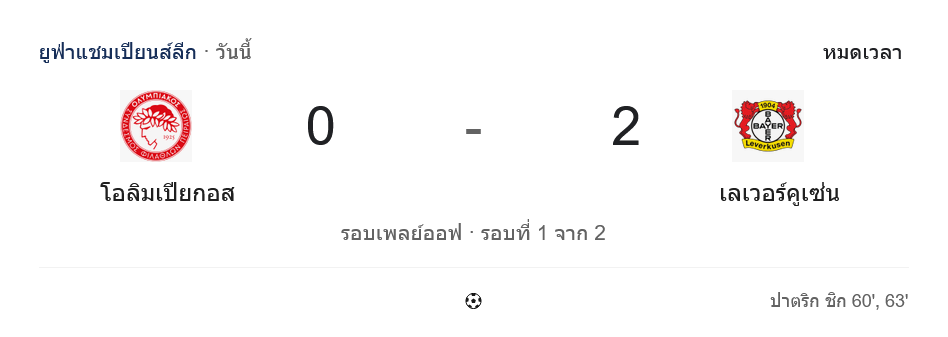 นี่คือเกมน็อกเอาต์แบบเหย้า-เยือน ผล 0-2 ทำให้เลเวอร์คูเซ่นกุมความได้เปรียบมหาศาลก่อนยกสอง เพราะถือ “สกอร์นำสองลูก” ติดมือกลับไปเล่นต่อในนัดถัดไป ขณะที่โอลิมเปียกอสเจองานหนักทันที ถ้ายังจบไม่คมแบบนี้ ต่อให้ครองบอลมากแค่ไหนก็มีสิทธิ์จบเส้นทางแบบเจ็บๆ