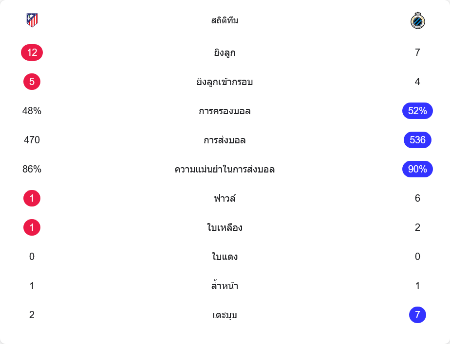 รูปเกมบอกว่าบรูชครองบอลมากกว่าเล็กน้อยที่ 52 เปอร์เซ็นต์ ขณะที่แอตฯ มาดริดอยู่ที่ 48 เปอร์เซ็นต์ ทีมเยือนจ่ายบอลมากกว่า 536 ครั้งและความแม่นยำสูงถึง 90 เปอร์เซ็นต์ ส่วนเจ้าถิ่นจ่าย 470 ครั้งความแม่นยำ 86 เปอร์เซ็นต์ แต่ตัวเลขที่ชี้ชัยชนะคือความคม แอตฯ มาดริดยิงรวม 12 ครั้งเข้ากรอบ 5 ครั้ง ขณะที่บรูชยิง 7 ครั้งเข้ากรอบ 4 ครั้ง ด้านลูกนิ่งทีมเยือนได้เตะมุมถึง 7 ครั้งมากกว่าเจ้าถิ่นที่ได้ 2 ครั้ง ทว่ากลายเป็นเจ้าถิ่นที่เปลี่ยนโอกาสเป็นประตูได้เด็ดขาดกว่า ใบเหลืองแอตฯ มาดริด 1 ใบ บรูช 2 ใบ และไม่มีใบแดงในเกมนี้