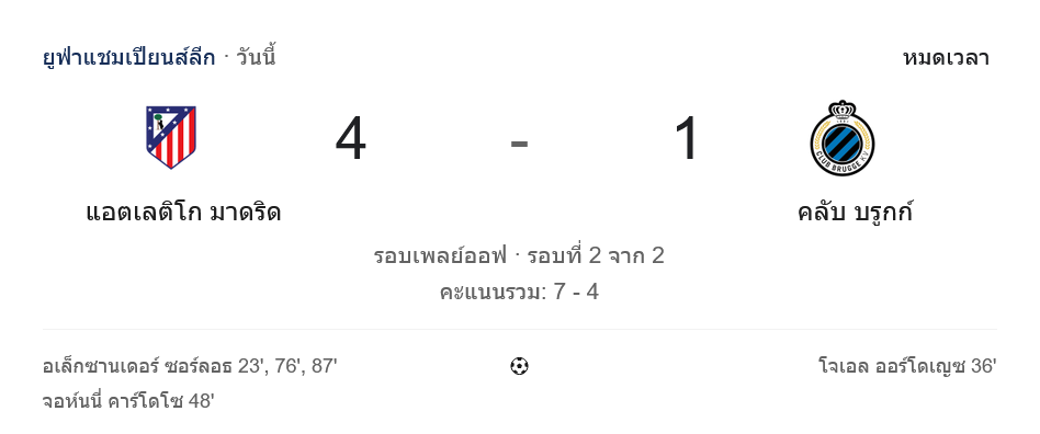 ชัยชนะ 4-1 พร้อมสกอร์รวม 7-4 ทำให้แอตเลติโก มาดริดคว้าตั๋วผ่านเข้าสู่รอบถัดไปของรายการแบบชัดเจน ส่วนคลับ บรูชต้องยุติเส้นทางไว้ที่รอบเพลย์ออฟ แม้เกมนี้มีช่วงที่สู้ได้และตีเสมอสำเร็จ แต่เมื่อเข้าสู่ครึ่งหลัง ความผิดพลาดเล็ก ๆ ในจังหวะสำคัญถูกลงโทษแบบหนักหน่วงจนเกมหลุดมือ