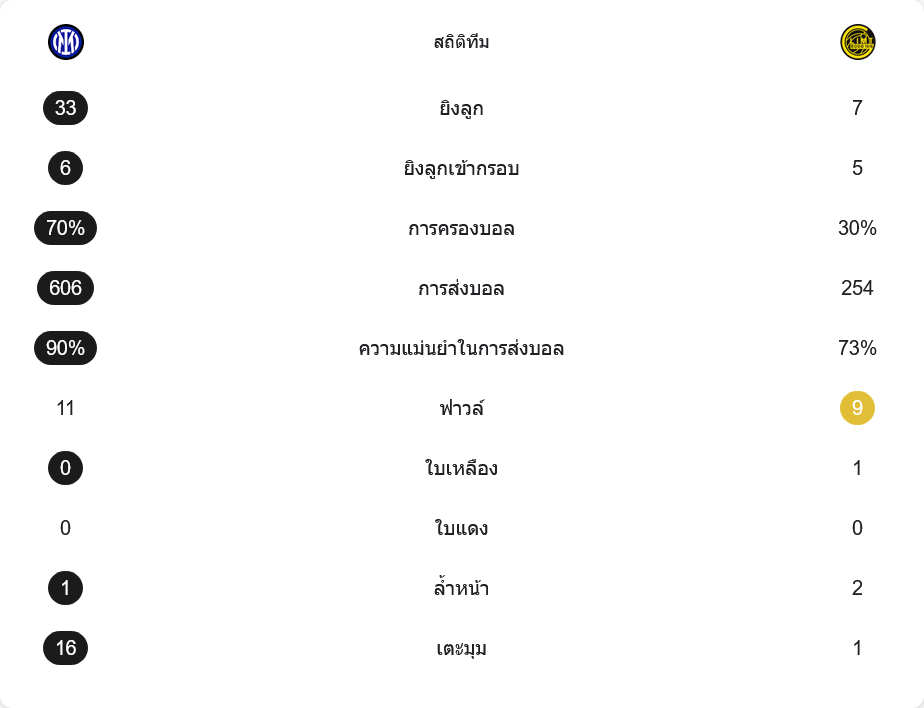 เกมนี้ภาพรวมเป็นของอินเตอร์ชัดเจน พวกเขายิงมากถึง 33 ครั้ง ขณะที่โบโดยิง 7 ครั้ง แต่จำนวนยิงเข้ากรอบกลับใกล้เคียง อินเตอร์ทำได้ 6 ครั้ง ส่วนโบโด 5 ครั้ง ซึ่งสะท้อนว่าทีมเยือนยิงน้อยแต่ได้คุณภาพมากกว่า การครองบอลอินเตอร์เหนือถึง 70 เปอร์เซ็นต์ พร้อมจำนวนการจ่าย 606 ครั้งและความแม่นยำ 90 เปอร์เซ็นต์ ส่วนโบโดครองบอล 30 เปอร์เซ็นต์ จ่าย 254 ครั้ง ความแม่นยำ 73 เปอร์เซ็นต์ อินเตอร์ได้เตะมุมถึง 16 ครั้ง แต่เปลี่ยนเป็นประตูได้แค่ลูกเดียว ขณะเดียวกันโบโดได้เตะมุม 1 ครั้งแต่ความอันตรายมาจากจังหวะสวนกลับมากกว่า เรื่องวินัยมีใบเหลืองฝั่งโบโด 1 ใบ อินเตอร์ไม่มีใบเหลือง เกมฟาวล์อินเตอร์ 11 ครั้ง โบโด 9 ครั้ง