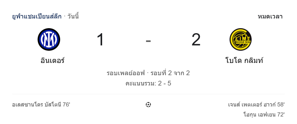 เกมนี้ ผลบอลสด ยูฟ่า แชมเปี้ยนส์ ลีก พลิกอารมณ์แฟนงูใหญ่แบบเจ็บลึก อินเตอร์ มิลาน ครองเกมแทบทั้งสนาม แต่โดนโบโด กลิมท์ เล่นงานด้วยความคมในจังหวะสุดท้าย จบ 90 นาทีเจ้าถิ่นแพ้ 1-2 และตกรอบด้วยสกอร์รวม 2-5