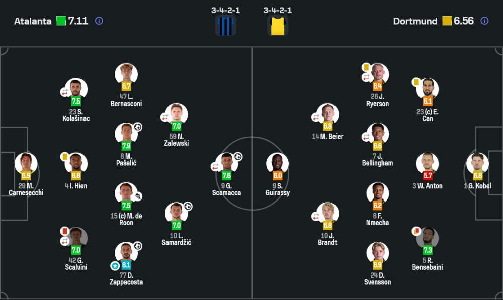 - คาริม อเดเยมี (7.3) แทน เบลลิงแฮม นาที 70 ลงมาสร้างความปั่นป่วนและยิงประตูตีไข่แตกสุดสวยให้ทีมเยือน