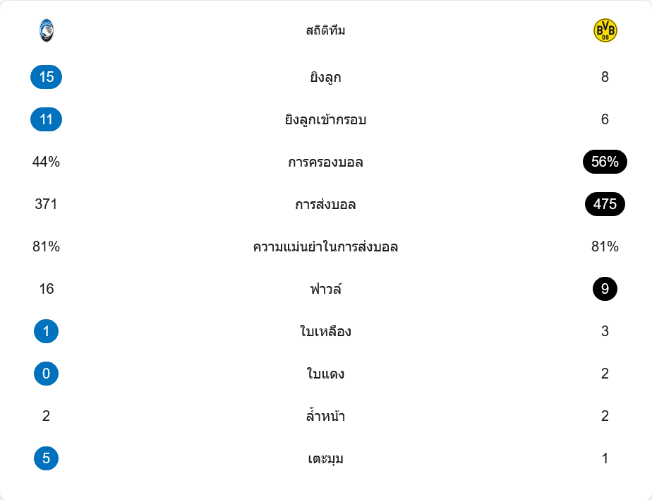 เกมนี้อตาลันต้าเสียฟาวล์ 16 ครั้ง ดอร์ทมุนด์ 9 ครั้ง ใบเหลืองเจ้าถิ่น 1 ใบ ส่วนทีมเยือน 3 ใบ แถมยังมีใบแดง 2 ใบจากจังหวะโวยวายช่วงทดเวลา ในขณะที่ลูกเตะมุม อตาลันต้าขึ้นนำ 5 ต่อ 1 ตัวเลขเหล่านี้ตอกย้ำว่าเจ้าบ้านดุดันกว่าในทุกมิติ ทั้งความกล้าเล่นและความเข้มของแท็กติก