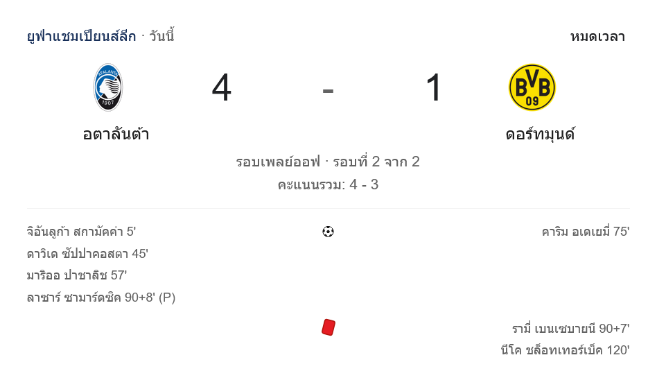 ท้ายสุด นาที 90+8 ลาซาร์ ซามาร์ดซิช ยืนรับหน้าที่สังหารจุดโทษ กดเต็มข้อเสียบมุมบนขวาอย่างเยือกเย็น พาอตาลันต้าหนีเป็น 4-1 ปิดกล่องแบบไร้ข้อกังขา จบ 90 นาที บ้านกีฬา สรุปให้ชัดว่าเจ้าถิ่นถล่มยับ 4-1 รวมสองนัดกลับมาเข้ารอบด้วยสกอร์รวม 4-3 ส่งดอร์ทมุนด์ตกรอบแบบช็อกแฟนบอลเยอรมัน