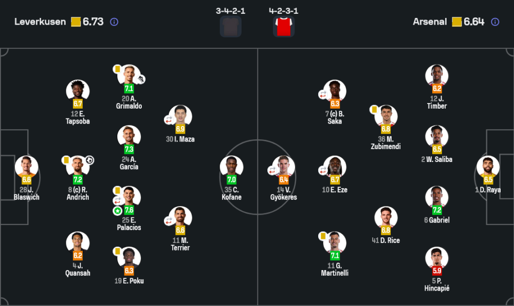 แม้คนยิงประตูจะเป็นอันดริชและฮาแวร์ตซ์ แต่คนที่โดดเด่นสุดตลอดเกมคือ เอเซเกล ปาลาซิออส ที่คว้า Player of the Match ด้วยคะแนน 7.6 จากบทบาทการคุมจังหวะ ไล่บีบ ตัดเกม และเชื่อมบอลจากกลางสนามได้อย่างมีคุณภาพ เขาคือแกนสำคัญที่ทำให้เลเวอร์คูเซ่นสู้กับอาร์เซนอลได้แบบไม่เป็นรอง