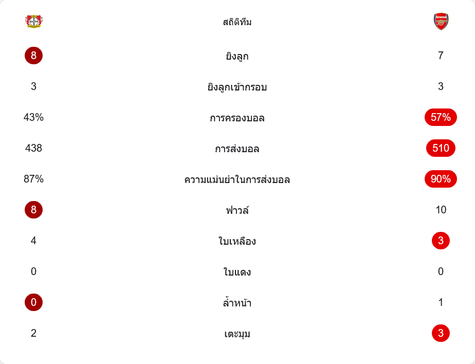 สำหรับแฟนบอลสาย บ้านผลบอล เกมนี้เป็นแมตช์ที่สูสีมาก เลเวอร์คูเซ่นดุดันกว่าในหลายช่วง ขณะที่อาร์เซนอลครองบอลดีกว่า แต่กว่าจะเจาะได้ต้องรอถึงช่วงท้ายเกม